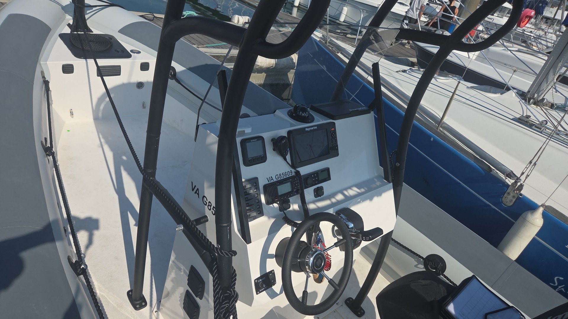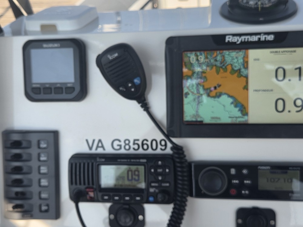 Enfin, il intègre des équipements modernes comme un système audio haute fidélité Fusion, un GPS Raymarine Element 9″, une VHF Icom IC-M423GE, ainsi qu’un équipement de sécurité complet conforme à la Division 240 avec gilets automatiques 150 N.